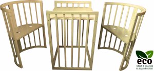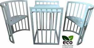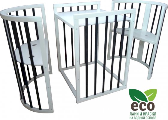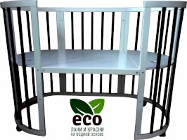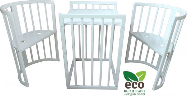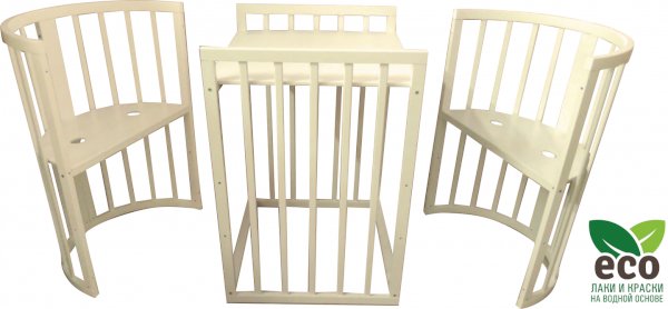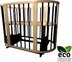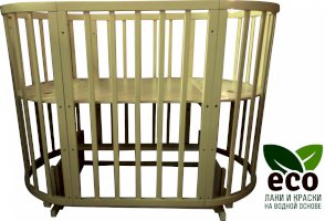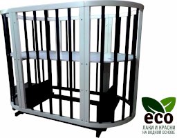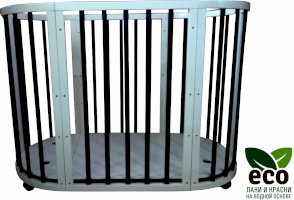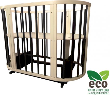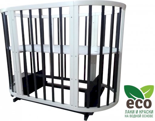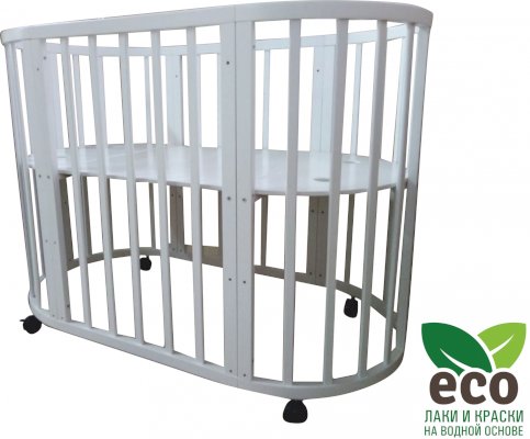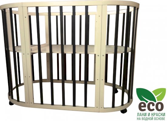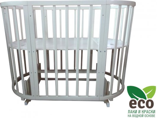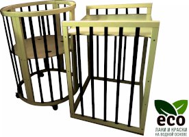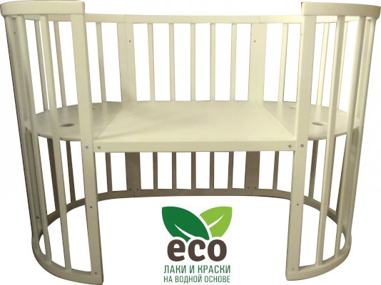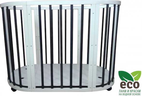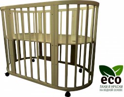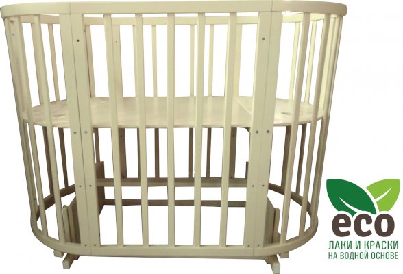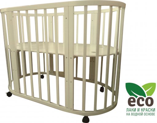 Выполнена из отборной бессучковой древесины березы без стыков, склеек и из высокопрочного МДФ. Привлекательный внешний вид достигается за счёт использования технологии скрытия стыков и метода тройной шлифовки. Покрыта нетоксичными лаками и красками на водной основе. В комплекте имеется 4 колёса с возможностью установки в различных положениях (для круглой и овальной кроватки).
