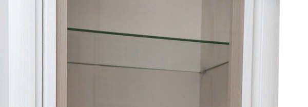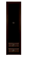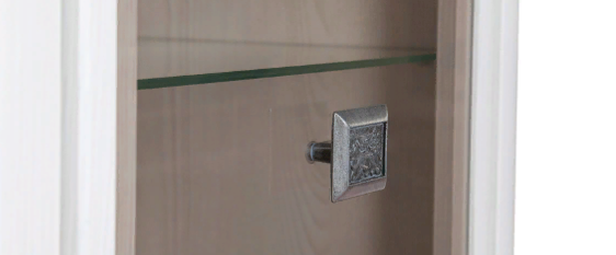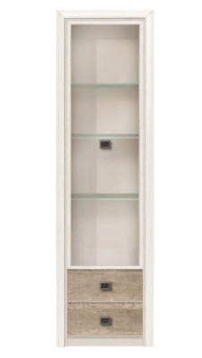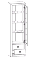 Шкаф имеет одно вертикальное отделение с тремя вкладными стеклянными полками и отделением с двумя выдвижными ящиками.