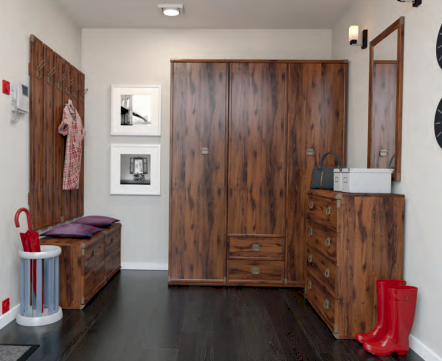 Оригинальный дизайн фасада, точно повторяющий текстуру отполированного дерева отлично впишется в современный интерьер. Дополняет общую композицию необыкновенная форма ручек и закругленные металлические края элементов мебели. В коллекцию Indiana входит большой ассортимент элементов мебели, который поможет создать интересный интерьер в комнате.