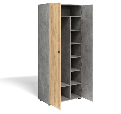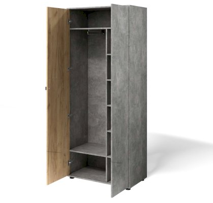 Современный шкаф в прихожую с двумя дверцами идеально решит вопрос хранения одежды в небольшом помещении. Благодаря небольшой глубине, антресольной полке и выдвижной штанге этот элемент мебели для прихожей не займет много места, но разместит вещи компактно и удобно.