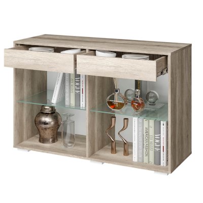 Большой комод Наоми, выполненный в цвете дуб каньон с темными фасадами, может стать привлекательным акцентом любой комнаты. За двумя распашными дверцами, в которые встроены тонированные стекла, расположены полки для хранения посуды или сувениров. А в верхние выдвижные ящики можно положить какие-то мелочи, аксессуары или документы.