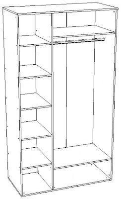 Внутреннее устройство шкафа предусматривает две секции: отделение с антресольной полкой и со штангой под одежду и отсек с шестью полками. Шкаф достаточно универсален, подходит для любой комнаты.