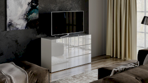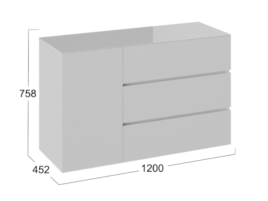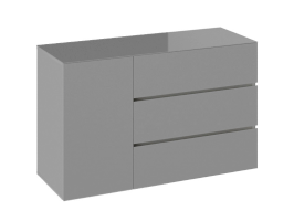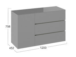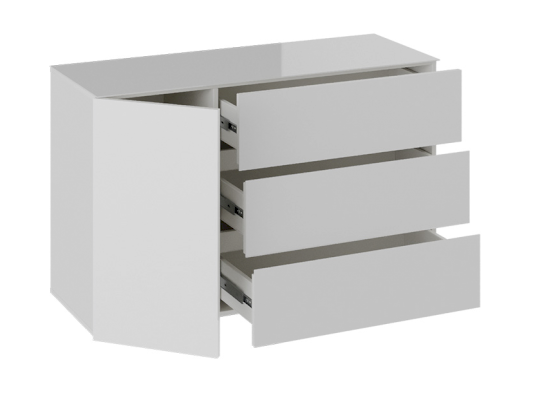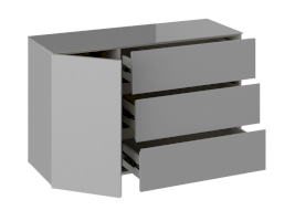 Выдвижные ящики комода оснащены шариковыми направляющими, которые позволят плавно и бесшумно открывать их и закрывать. Открытие боковой дверцы происходит с помощью нажатия на фасад.