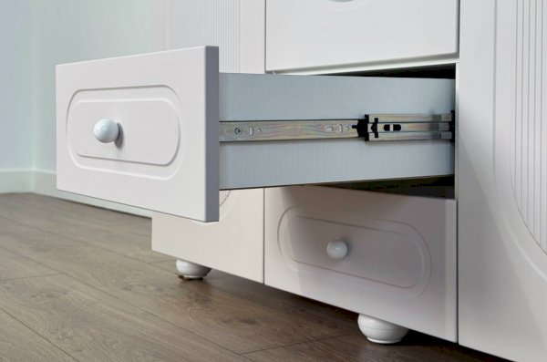 Корпус шкафа выполнен из ЛДСП толщиной 16 мм, фасады изготовлены из МДФ в плёнке ПВХ и декорированы фрезеровкой. Оригинальные круглые ручки и опоры подчёркивают стиль мебели и придают ей визуальную лёгкость.