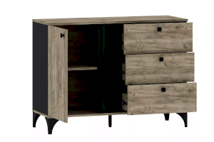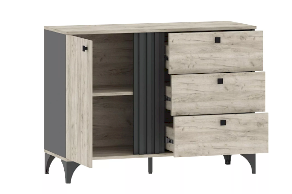 Тумба Отис предназначена для тех, кто ищет необычный дизайн в модной цветовой гамме дуба с контрастным антрацитом. Реечные фасады смотрятся не только лаконично и эффектно, но и по-особенному изящно. Тумба оснащена распашной дверью с двумя отделениями для хранения и тремя ящиками, которые выдвигаются плавно и бесшумно благодаря шариковым направляющим, а высокие опоры обеспечивают легкий и быстрый доступ во время уборки.